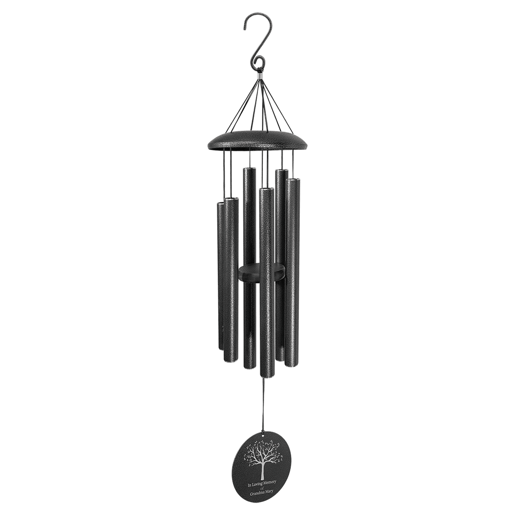 This black powder coated aluminum wind chime features a 5 1/2" disc that can be laser engraved on both sides. Six, 1" diameter tubes range in length from 11 1/4" to 16" and produce a beautiful rich tone in the slightest breeze.