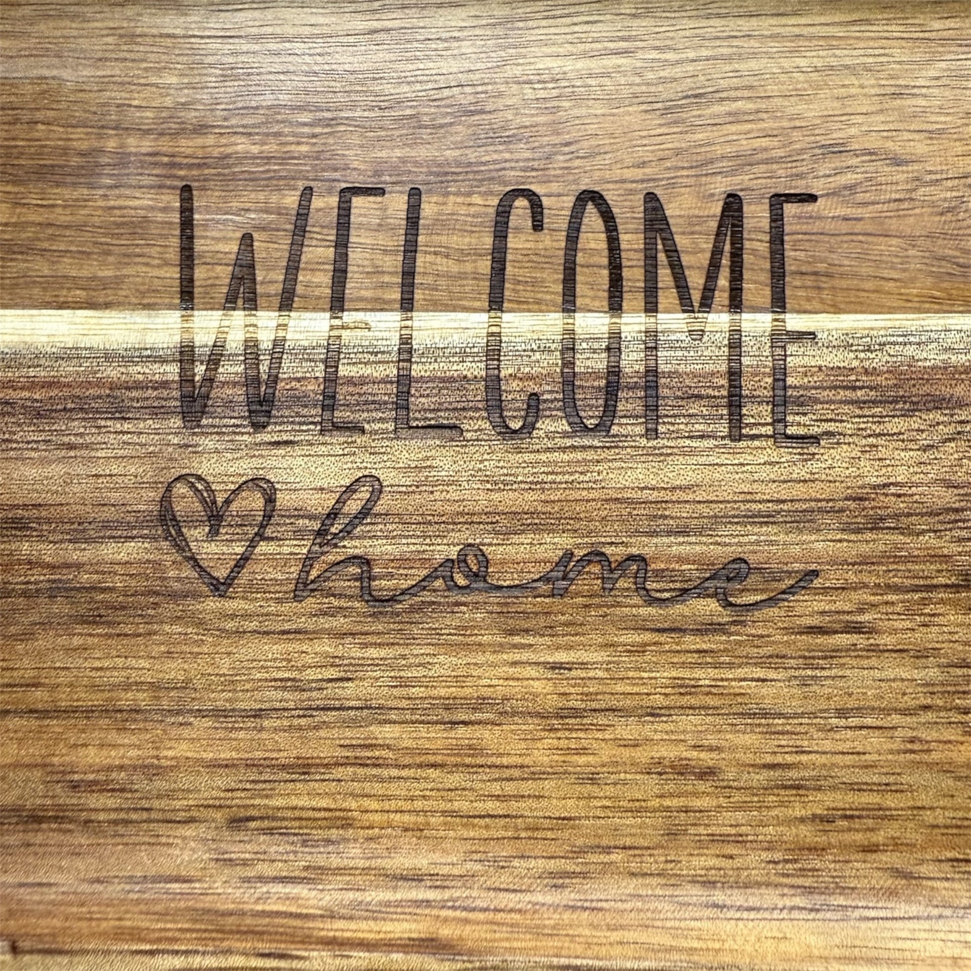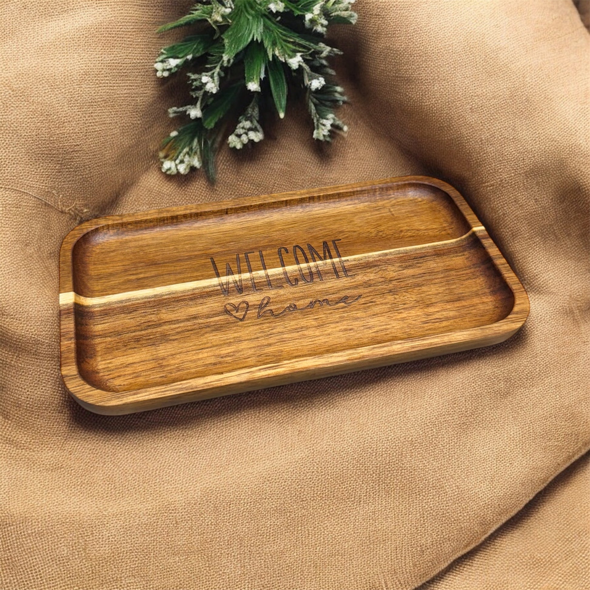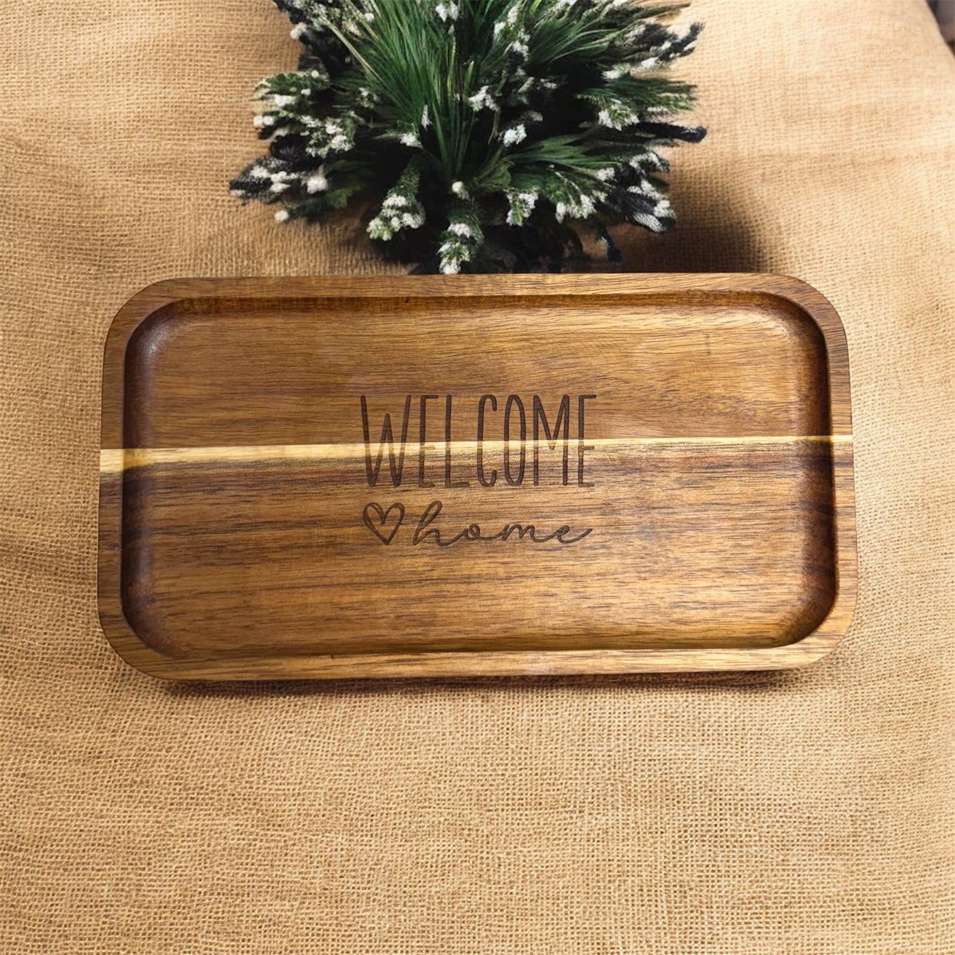 Crafted from rich acacia wood, this 10.25” x 5.5” tray is perfect for holding keys, jewelry, or everyday essentials. The laser-engraved “Welcome ♥ home” design adds a warm touch to any entryway, countertop, or bedside table.